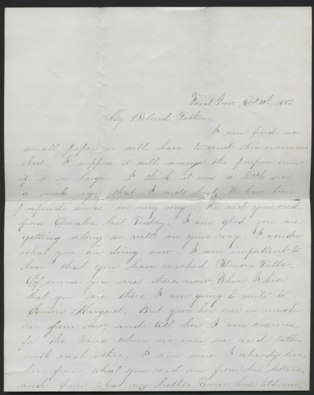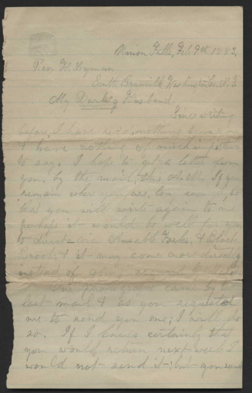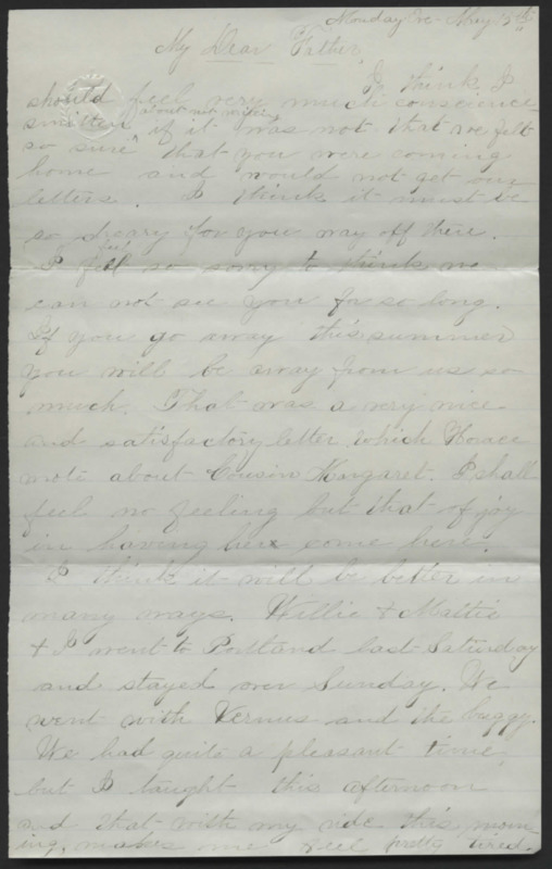 Letter from Margaret Duncan Lyman to her father-in-law, Reverend Lyman, and to her husband/cousin, Horace Sumner Lyman. She expresses her concern for him and how much she misses him.