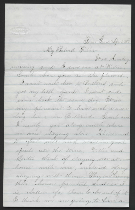 Letter from Mary Frances Lyman to her parents, Reverend and Mary Denison Lyman, on a weekend trip to Portland, teaching at the Indian Training School, and the weather.