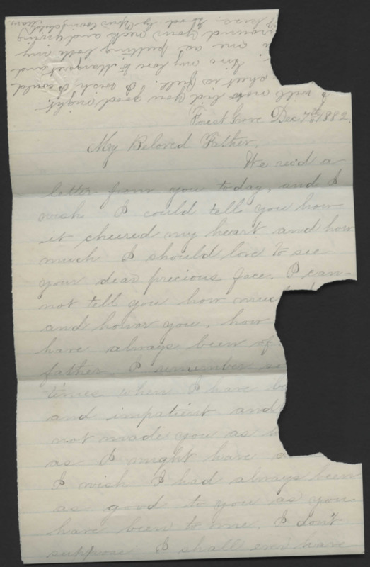 Letter from Mary Frances Lyman to her parents, Reverend and Mary Denison Lyman, concerning her dreams, missing her father, visiting Pacific University, and runaway Indian boys.