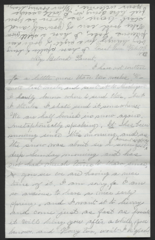 Letter from Mary Frances Lyman to her parents, Reverend and Mary Denison Lyman. She discusses her light workload at the Indian Training School, cleaning her house, and a description of gifts she sent.