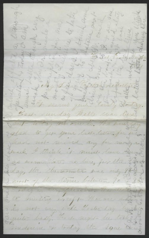 Letter from Margaret Duncan Lyman to her father-in-law, Reverend Lyman, and to her husband/cousin, Horace Sumner Lyman. She gives her husband tips on contacting her and discusses the weather.