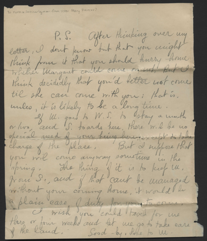 End of a letter from Mary Frances Lyman to her parents, Reverend and Mary Denison Lyman. She requests that they wait to return home until all of their party can join them.