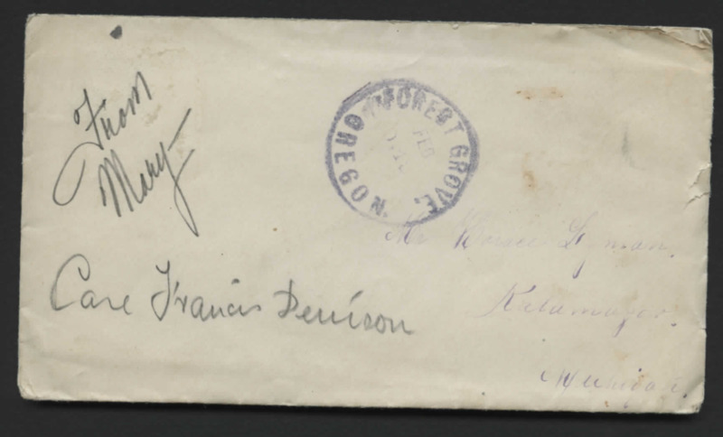 Envelope from Mary Frances Lyman to her parents, Reverend and Mary Denison Lyman. This letter was placed in the care of Mary's uncle, Francis Denison. Francis was the brother of Mary Denison Lyman and lived from 1813 to 1892.