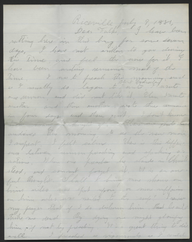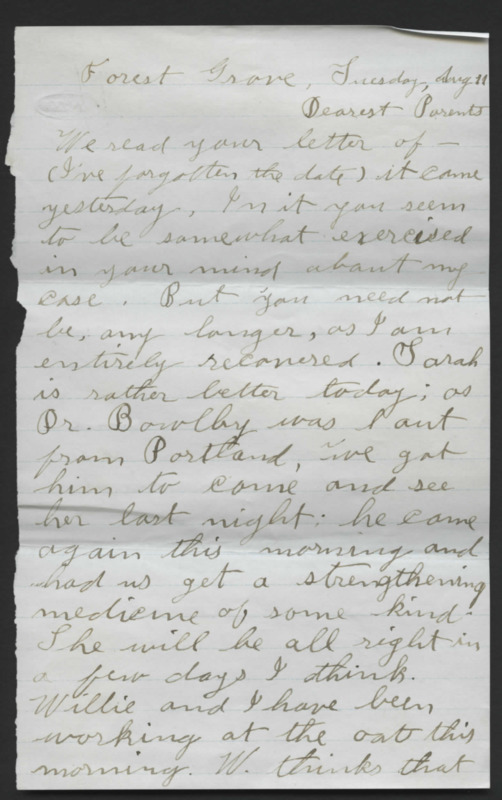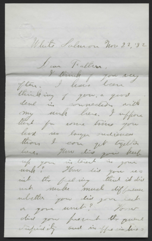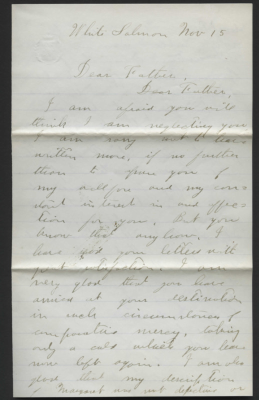Letter from Horace Sumner Lyman to his father, Reverend Horace Lyman. He discusses Margaret Duncan, requesting his father to write an autobiography, and a trip to Camas.