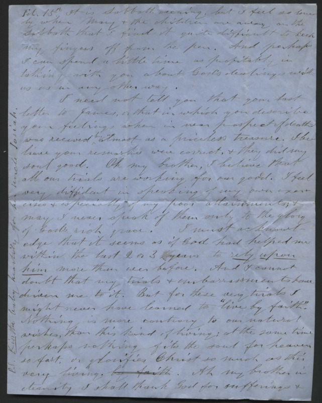 Letter from Josiah Lyman to his brother and sister-in-law, Reverend Horace and Mary Denison Lyman. He discusses family visits, his telescope, house-building, and his own poor health.