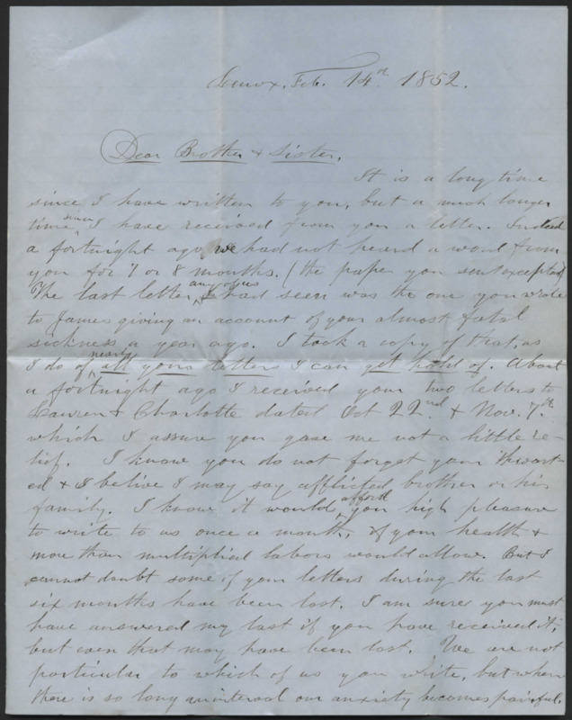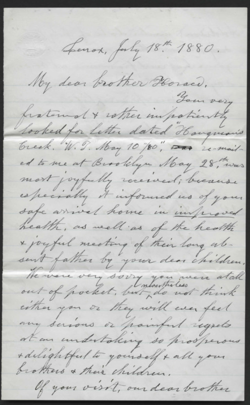 Letter from James Lyman to his brother Reverend Horace Lyman. He discusses the news of the family, including the house-building business, running a hotel, a birth, and Aunt Gross' death.