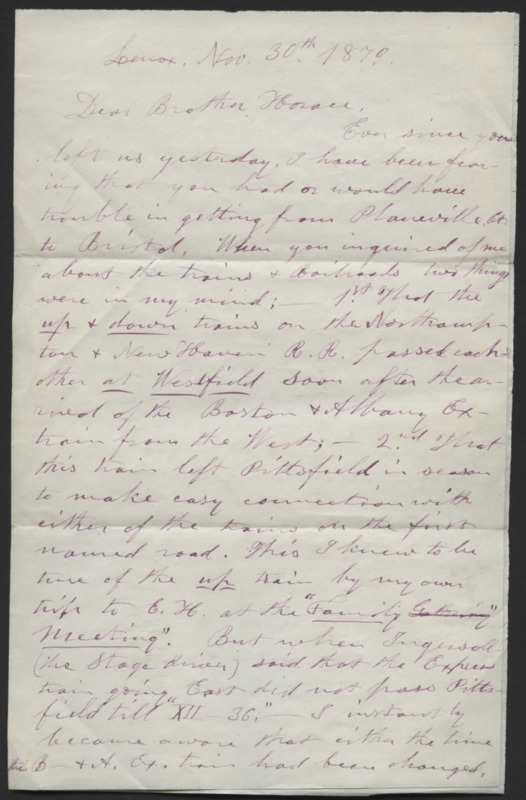 Letter from Josiah Lyman to his brother and sister-in-law, Reverend Horace and Mary Denison Lyman. He discusses trains and his concern for their travels following a visit.