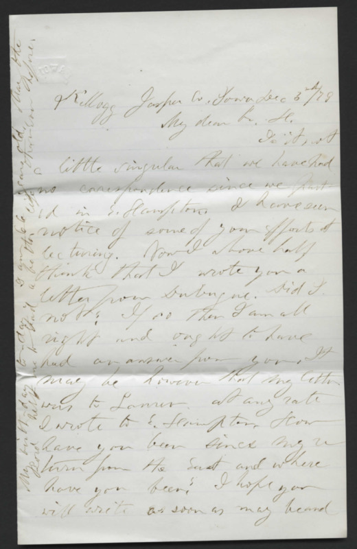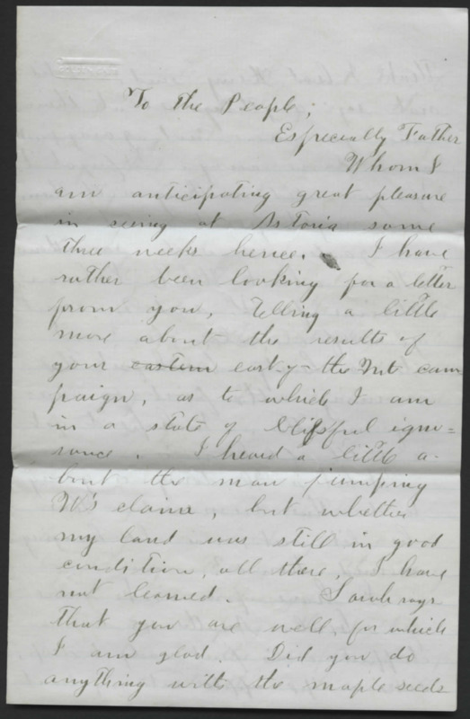 Letter from Horace Sumner Lyman to his family during his time at Pacific University. He discusses land claims, his sister teaching, plans to attend Oberlin Seminary, finances, and rain.
