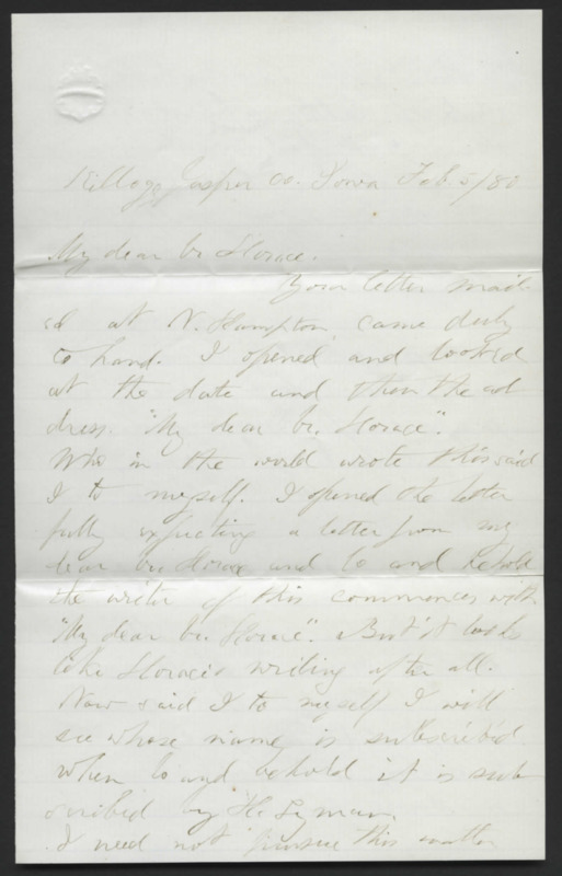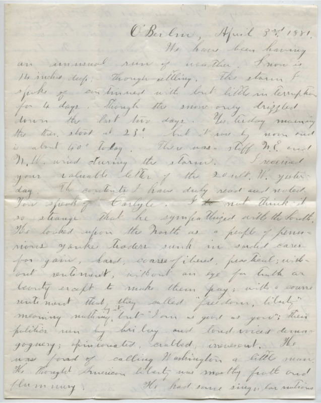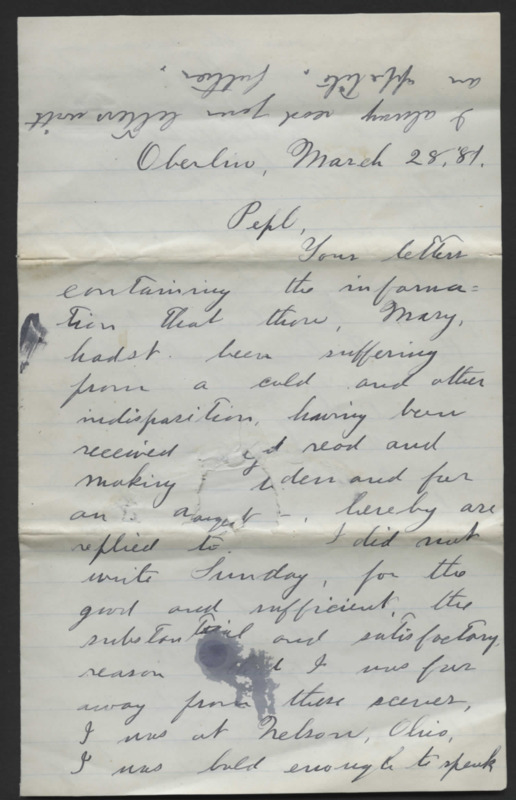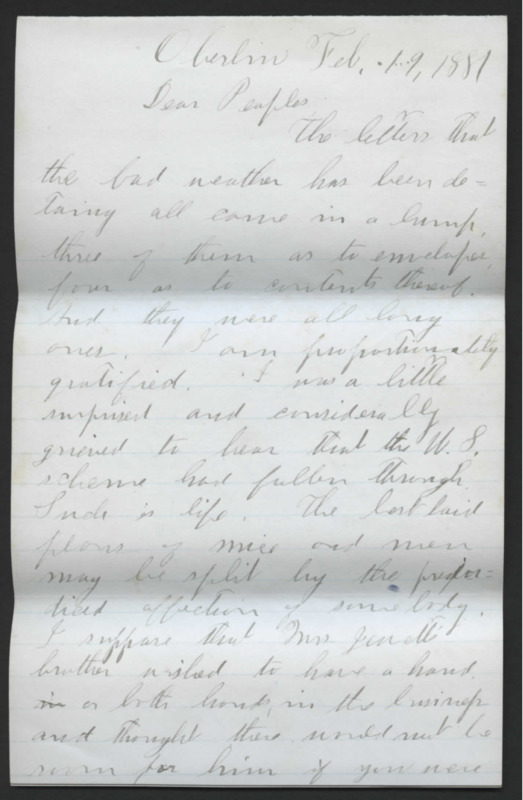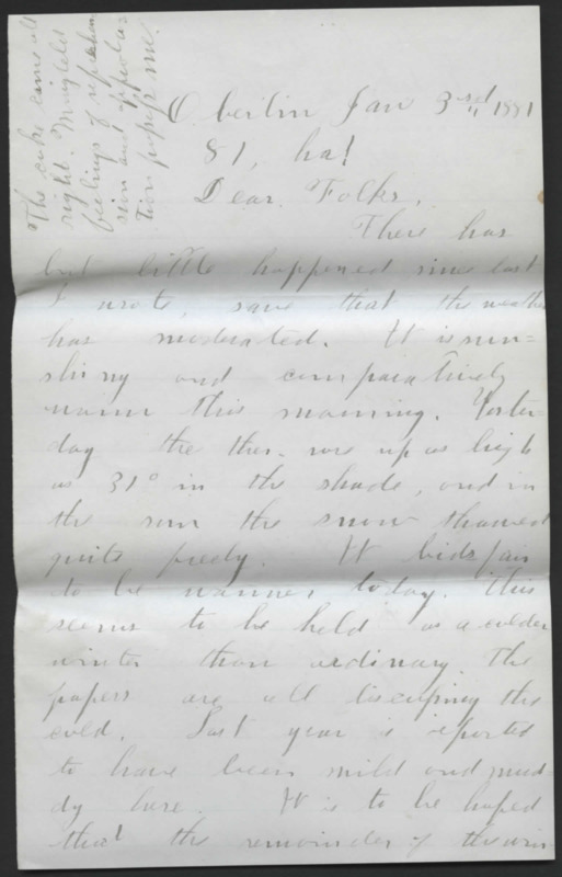 Letter from Horace Sumner Lyman to his family during his time at Pacific University. He discusses the weather and goes into great detail concerning a plan for his sister, Sarah, to attend Pacific for music.