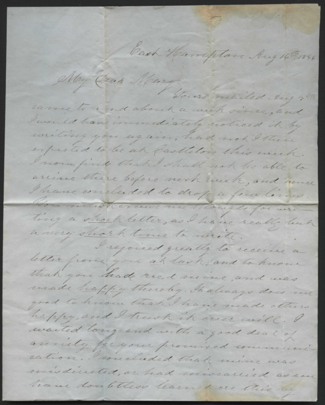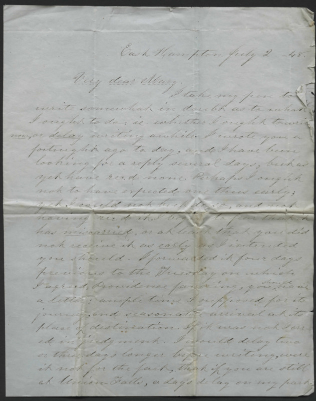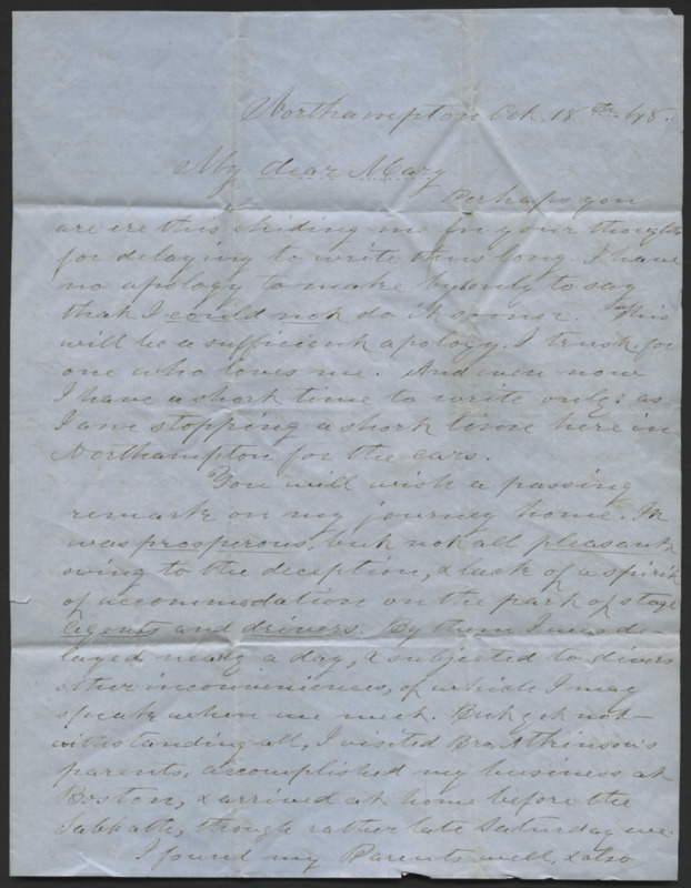Letter from Reverend Horace Lyman to his future wife, Mary Denison Lyman. He discusses his travels, visiting his parents, and his pleasure at Mary confiding in him.