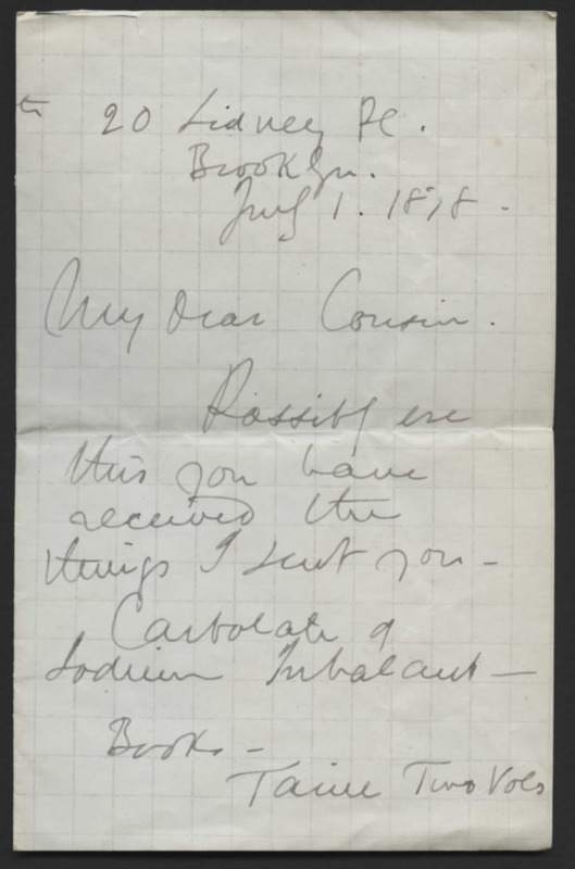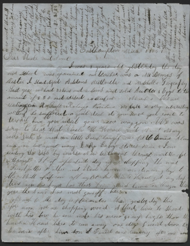 Letter from Eunice Lyman to either Sarah or Mary Frances Lyman. She discusses her routine, teaching, writing letters, and winning books with spelling. It is unclear how closely the two women were related, as the term cousin, at the time, could be used for any relative other than a sibling or child.