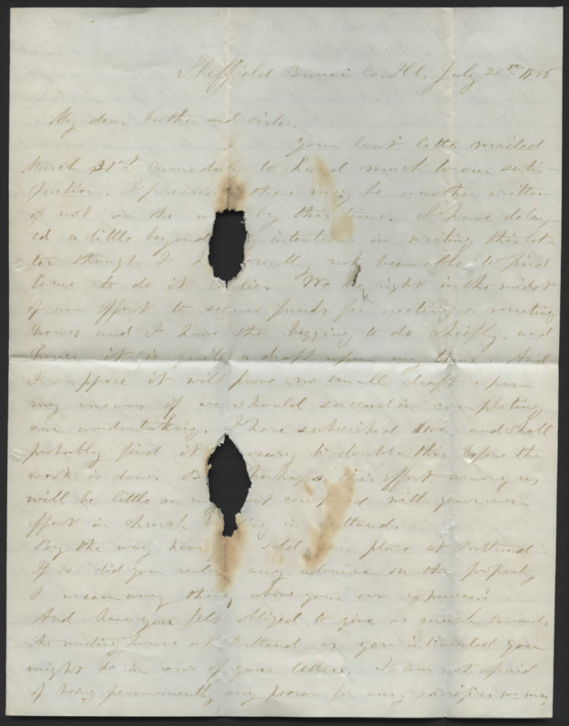 Letter from Addison Lyman to his brother and sister-in-law, Reverend Horace and Mary Denison Lyman. He discusses raising funds for a church, wheat crops, politics, and Josiah Lyman's debt.
