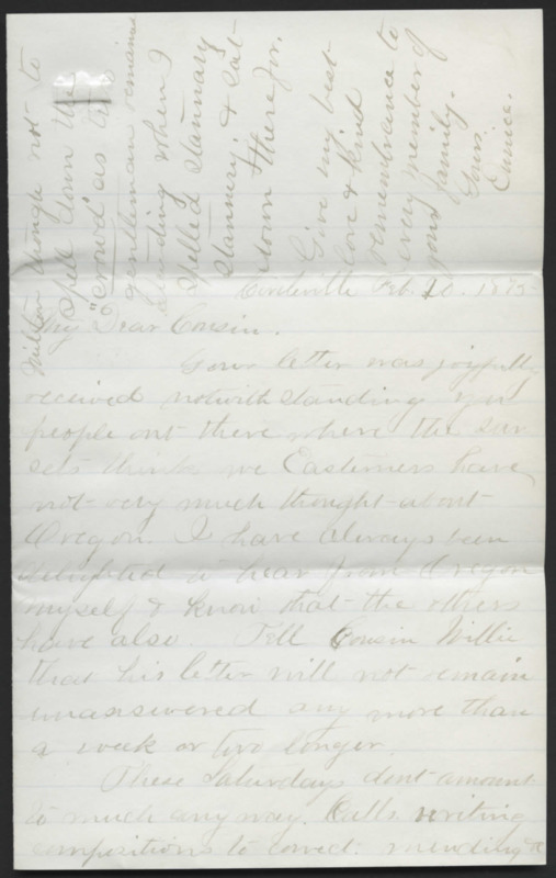 Letter from Horace Sumner Lyman to his family during his time at Pacific University. He discusses the country's weather and the possibility of Mary, his sister, attending Pacific University.