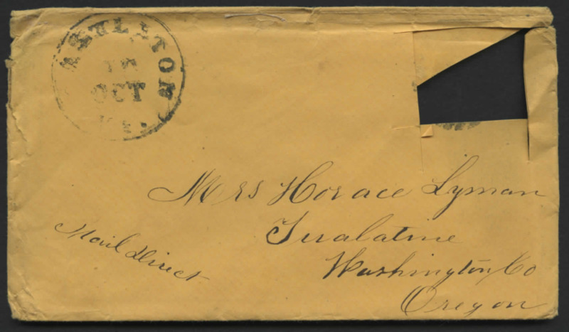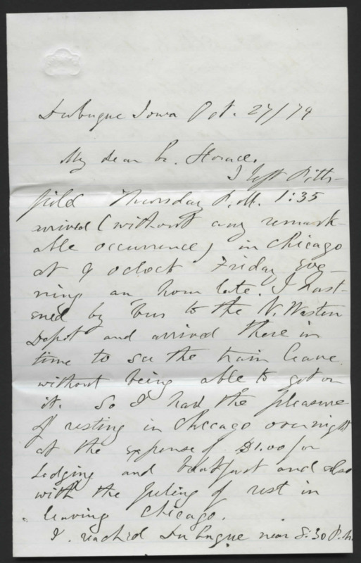 Letter from Reverend Horace Lyman to his wife, Mary Denison Lyman. He discusses being worried about his letter being misdirected and their plans of moving to Oregon.