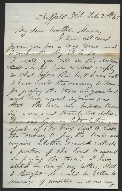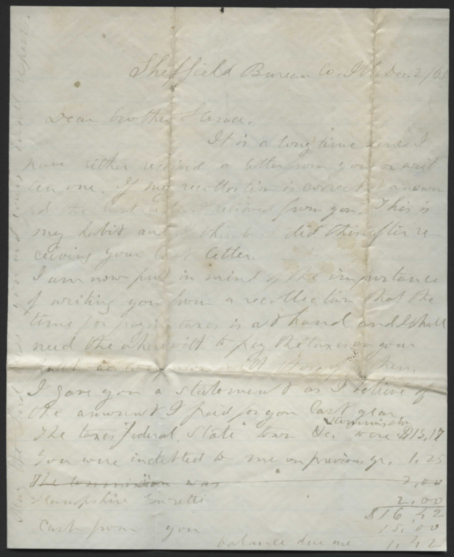 Letter from Addison Lyman to his brother, Reverend Horace Lyman. He discusses getting tax money from his brother, family health, receiving clothes on Thanksgiving, the Civil War, and his fiftieth birthday.