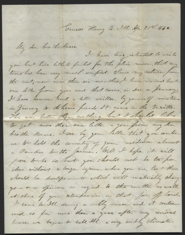 Letter from Addison Lyman to his brother, Reverend Horace Lyman, with an additional note from Lauren Lyman. He discusses his absent wife, poor crops, and a visit to Minnesota.