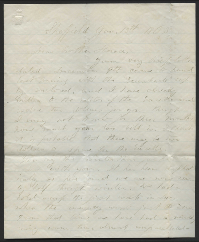 Letter from Addison Lyman to his brother, Reverend Horace Lyman. He discusses the winter weather and the Civil War following the Emancipation Proclamation.