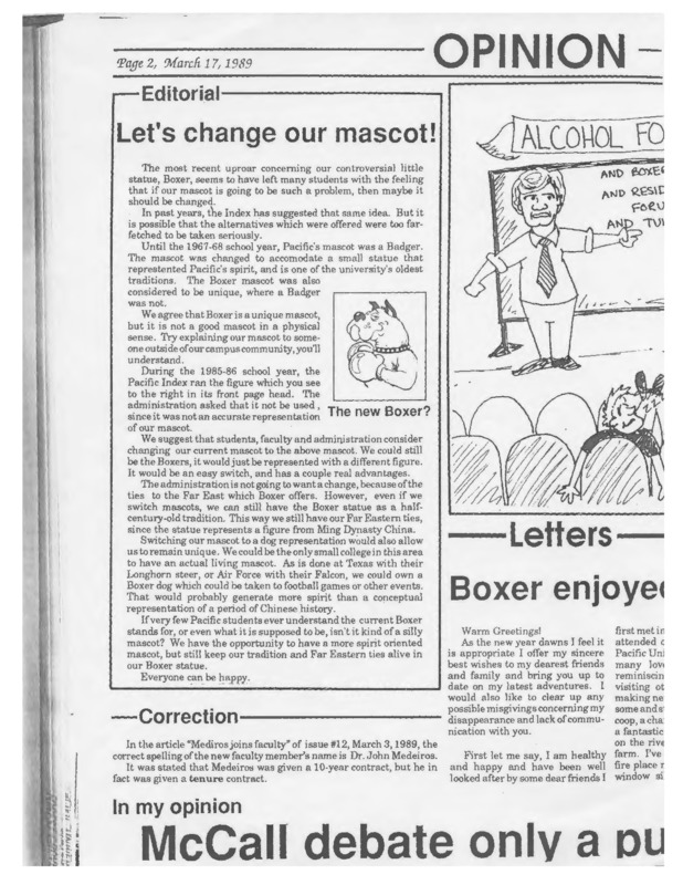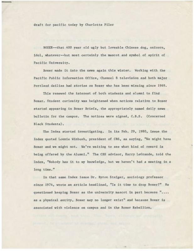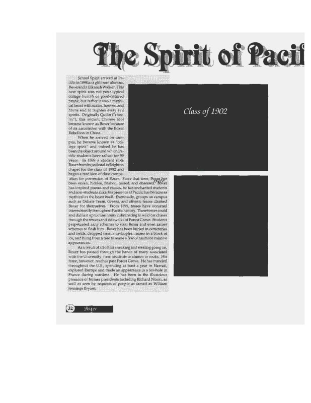 A brief history of the Boxer mascot for Pacific University is mentioned in one of the articles. The rest of the articles focus on the past history of the Boxer in terms of his whereabouts and the significance it had to the student body. Various groups, clubs and athletic teams had a chance to possess Boxer, but when he disappeared for a long amount of time than usual there was a replacement mascot put into effect, sparking a 'toss out' of the original Boxer. Later on the replacement mascot was stolen by a student to ensure that the Boxer remained the 'Spirit of Pacific'.