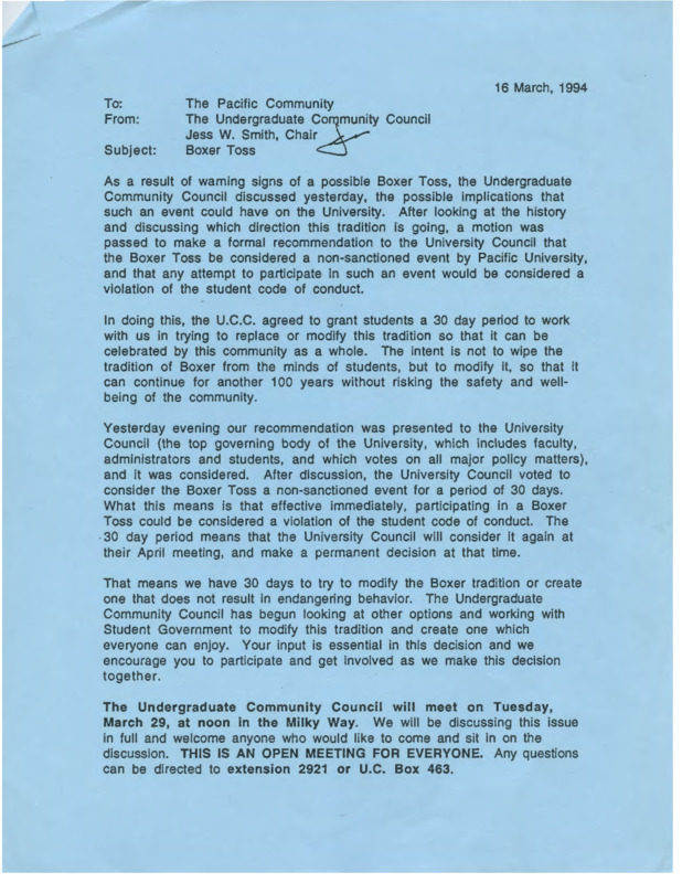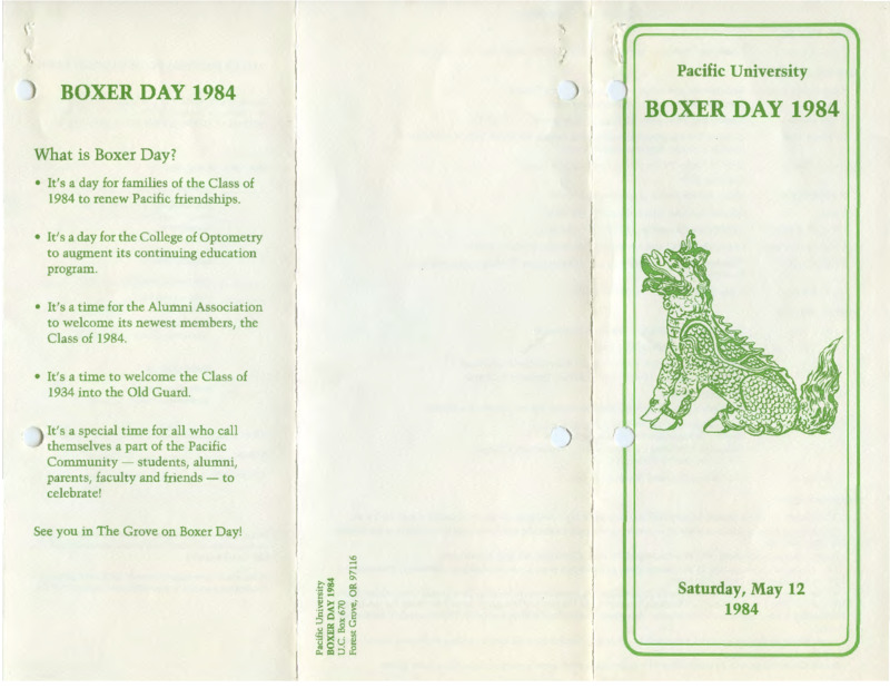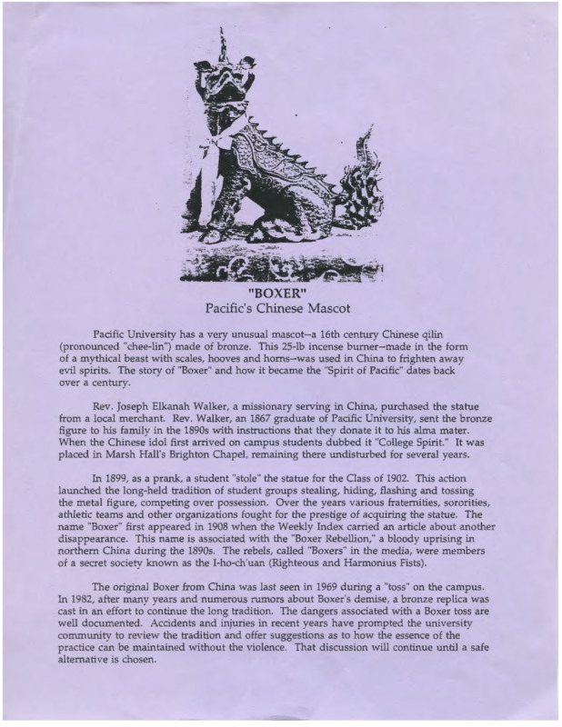 This flier gives a short history of the background of the Boxer and how the Boxer ended up at Pacific University. There is also information regarding how the Boxer 'toss outs' started and the significance of them to the students.