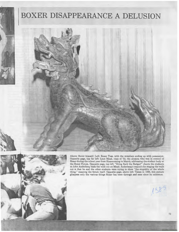 An image and short article describing the whereabouts of "Boxer II," a bronze replica of Pacific University's original "Boxer" mascot, between 1984-1985. The article states that Boxer II had been out of public view for most of those two years, but that it resurfaced on campus in May, 1985. The winners of the fight for Boxer at that time were members of the Gamma Sigma fraternity, whose symbol appears in the photograph above the article. The photograph, however, may be faked: the image of Boxer appears to have been cut out from another source and pasted onto the image of the table.