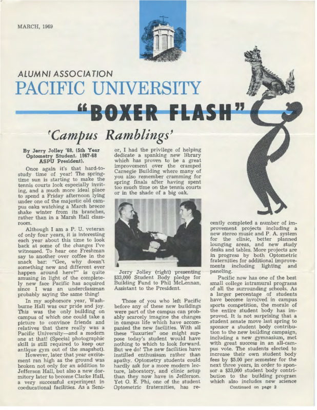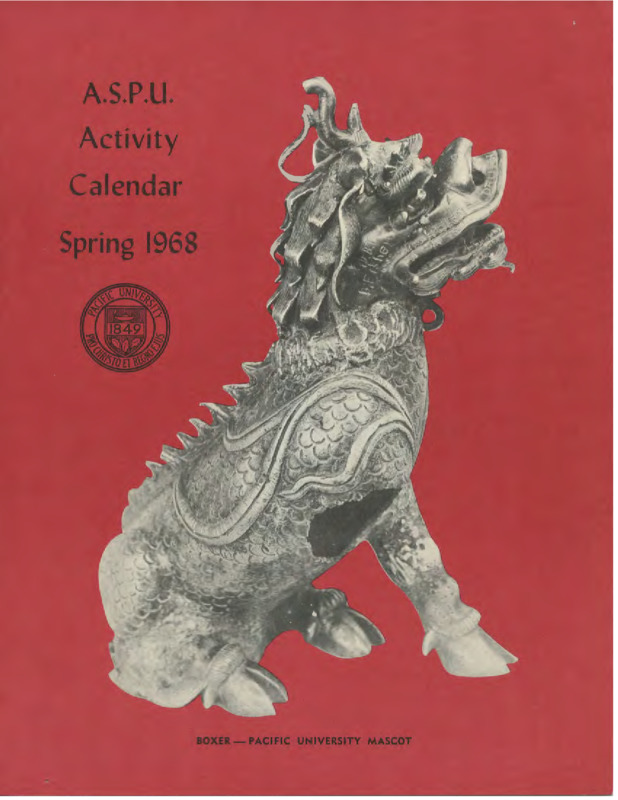 The A.S.P.U. (Associated Students of Pacific University) Calendar from Spring 1968, showing an older photograph of the school's original Boxer statue on its cover. The calendar includes information about social, academic and sports events on campus. The photograph dates from an earlier decade. It is nearly identical to a photograph that was most likely taken by photojournalist Ellis Lucia in the late 1940s or early 1950s (Pacific University Class of 1944; see PUA_MS104_0001). The image shows Boxer missing one leg and his tail, with welding marks visible on his other leg and neck. This damage was sustained during "Boxer Tosses," when students would fight over possession of the statue.
