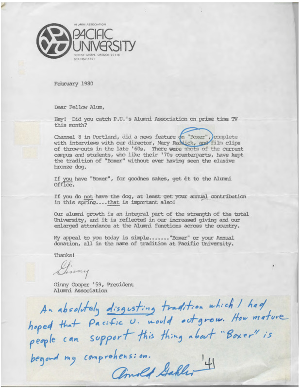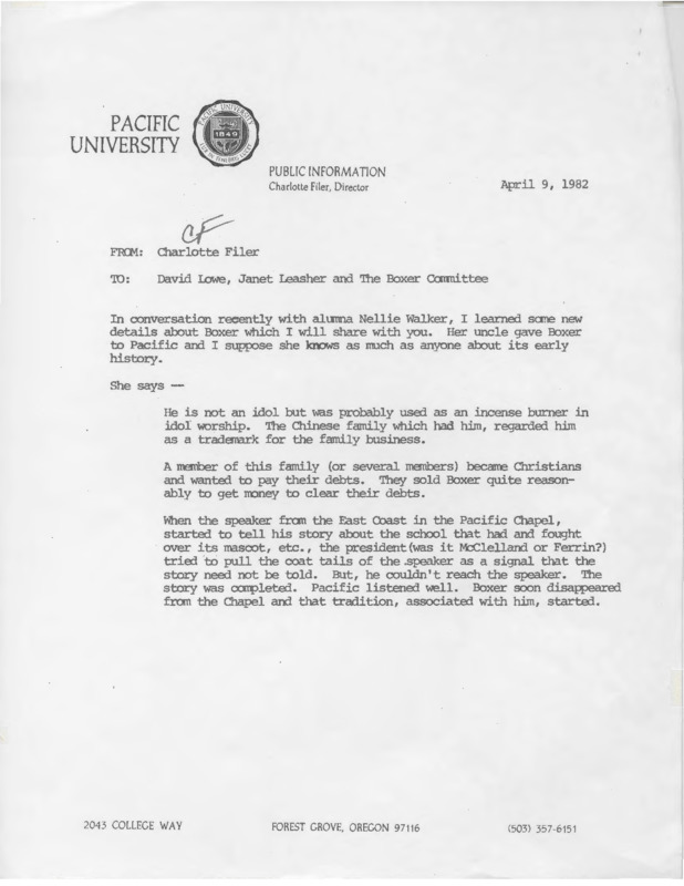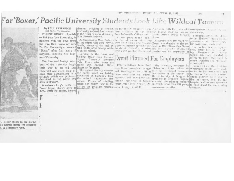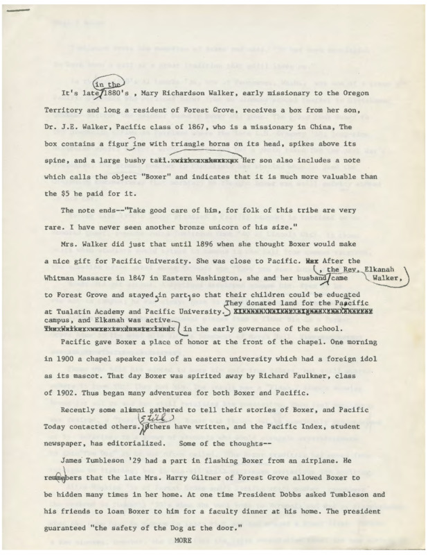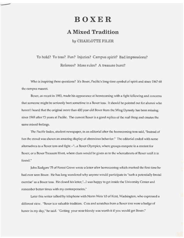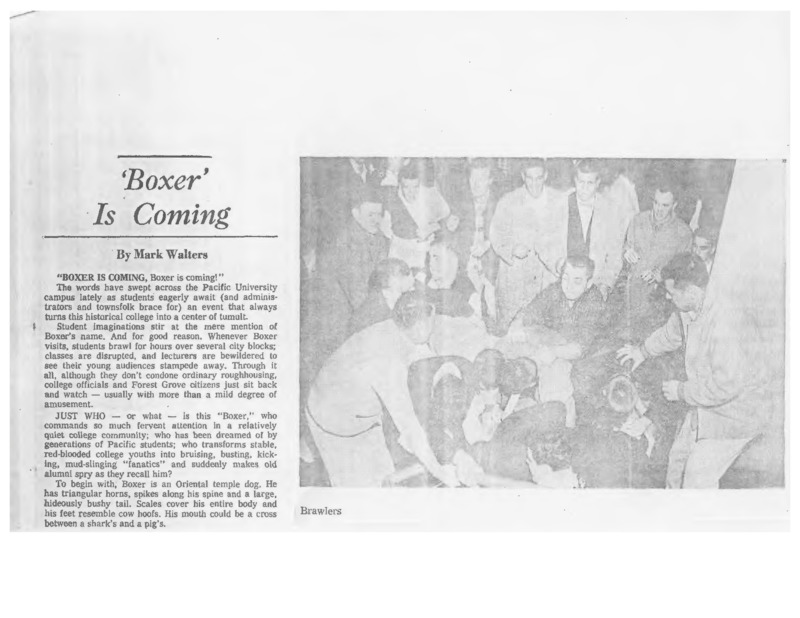 This collection brings together archival material on the history of 'Boxer,' Pacific University's mascot. Letters, news clippings, photographs and other items are included, illustrating its history from when the Boxer statue first arrived on campus in the 1890s through its disappearance in 1970. Efforts to find, recreate and commemorate the statue since that time are also covered.