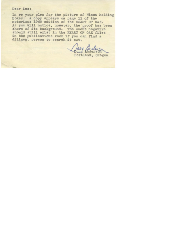 Members of Pacific University's Alpha Zeta fraternity with President Nixon, who is holding the school's mascot, Boxer. The students met Nixon during his 1968 presidential campaign near a hotel in Beaverton or Tualatin, Oregon. Three versions of the image are attached. The newspaper version of the image with a printed caption appeared in an article by Phil Way on Boxer's disappearance titled, '1974 ... Saga of missing Boxer continues.'