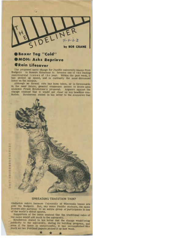 A booklet researched and written by a group of Pacific University students in 1962, providing their views on the history of university's "Boxer" mascot. While some of the information this booklet provided was correct, it also includes numerous rumors, stories and inaccuracies.