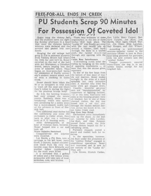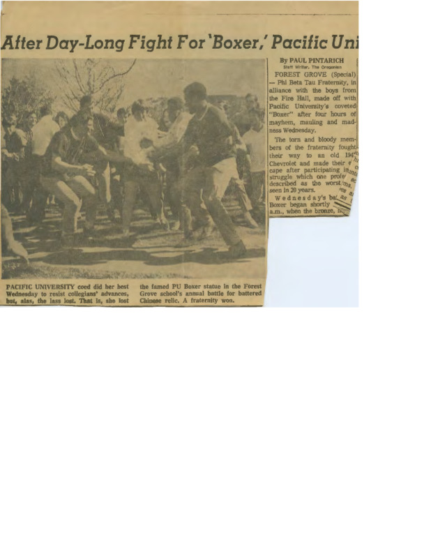 An article from the Forest Grove News-Times with images from a "Boxer Toss" that had just occurred at Pacific University in June 1964. A Boxer Toss was a fight between students for possession of "Boxer," a bronze statue that would later become the university's official mascot. The article describes the history of the Boxer tradition at Pacific University as well as the events of the Toss.