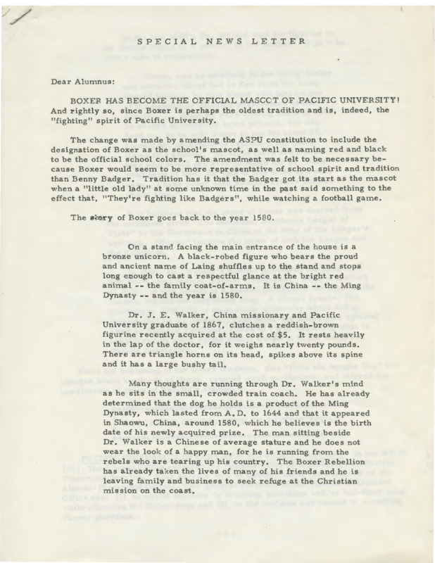 A letter dated January 28, 1968 from Jerry Jolley, president of the Associated Students of Pacific University (ASPU), to Gordon Bolton, director of Pacific University's Alumni Association. Jolley announces that the student senate had voted unanimously to change the university's official mascot from 'Badger' to 'Boxer.' Jolley notes that the change had been approved by the alumni, the administration and the students, and that a ceremony in honor of the change would be planned soon.