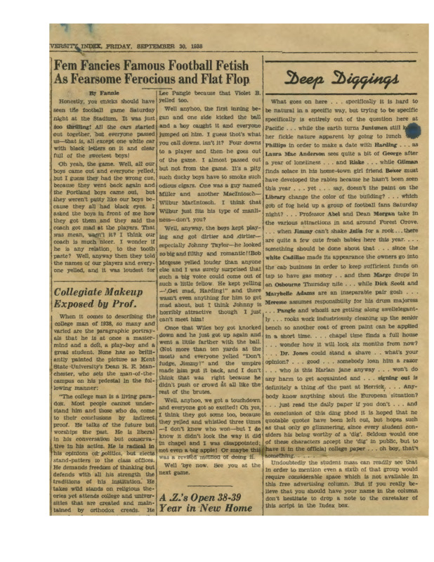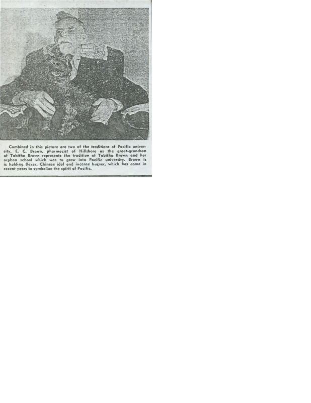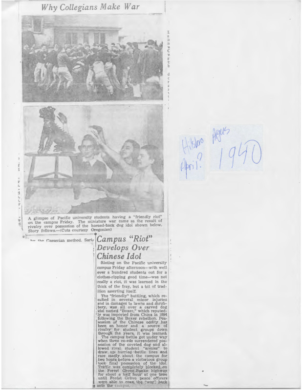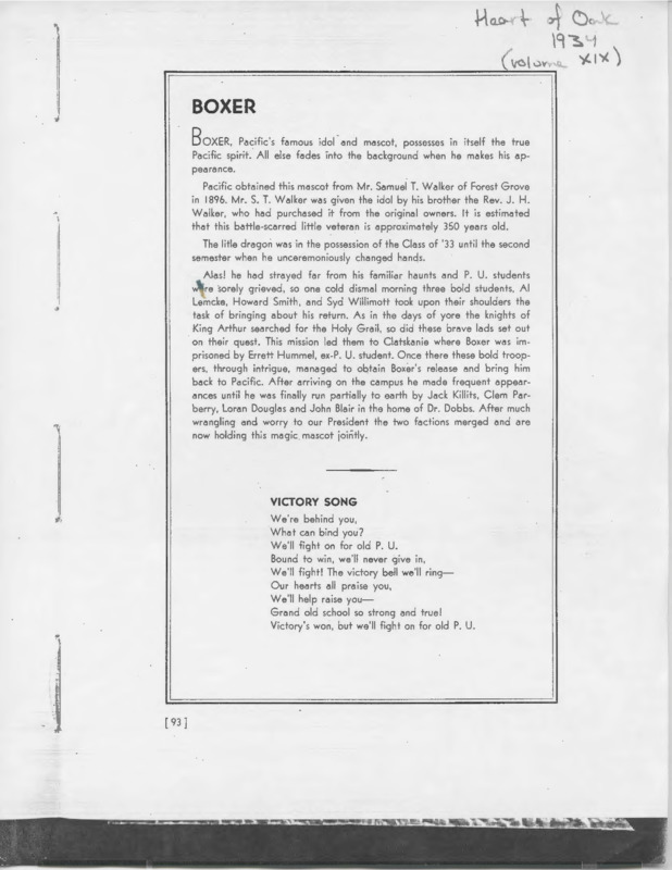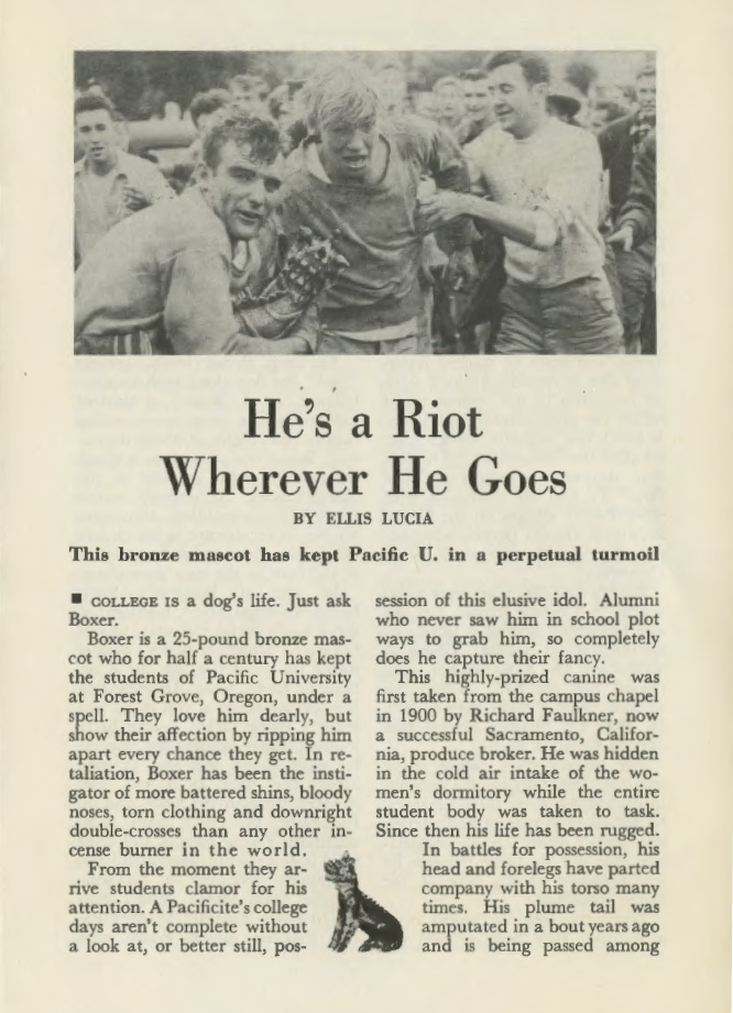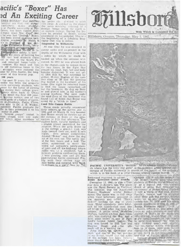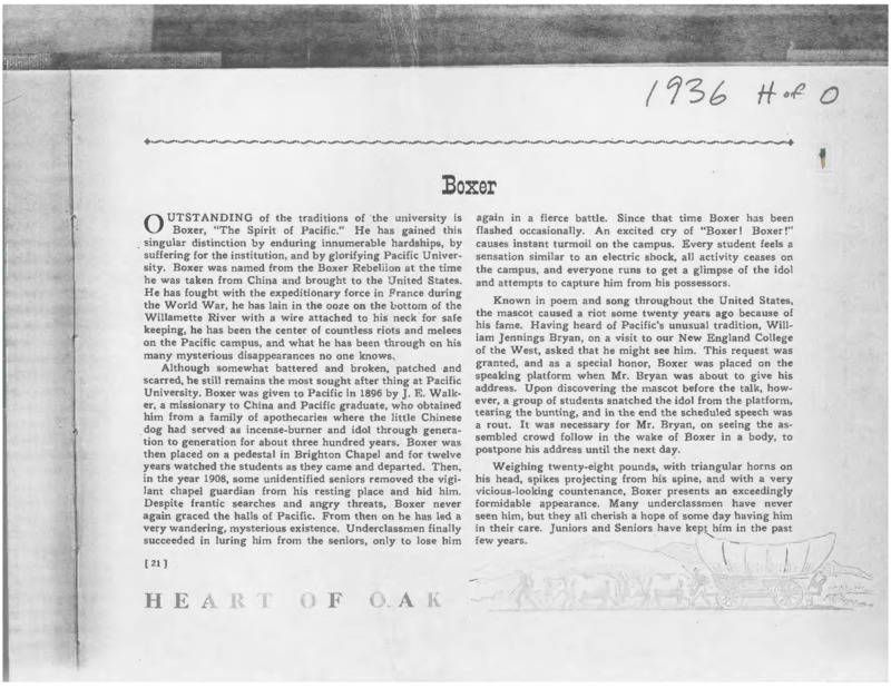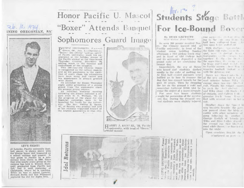 A news article describing how three Pacific University students and football players, Al Lemcke (Class of 1936), Syd Willimott and Howard Smith, captured "Boxer" from its previous owner, alumnus Erret Hummel (Class of 1933). Boxer was a bronze Chinese statue which later became the mascot of Pacific University. The article describes campus traditions about Boxer, including some tall tales about its history.