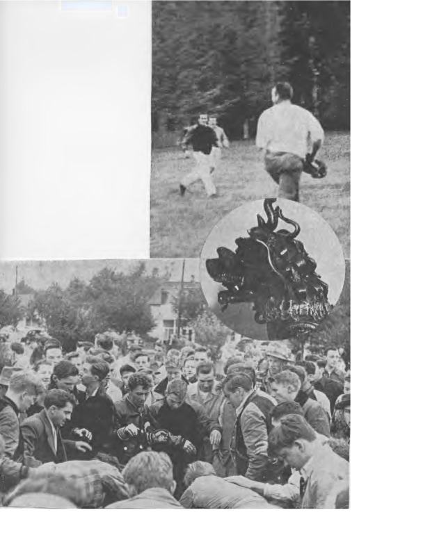 A copy of a newspaper photograph showing Pacific University freshman student Bob Conover (Class of 1960) fighting over the school's Boxer statue. In this fight, which the students called a "Boxer Toss," student groups were fighting to gain possession of the statue, which had been frozen into a block of ice. This appears to have occurred during Homecoming festivities on Oct. 29, 1955 according to other newspaper accounts.