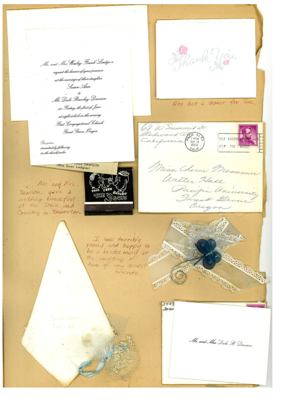 Put together by Cheron Mayhall née Messmer in one of her many scrapbooks, this page is dedicated to the commemoration of Susan Ann Lindgren's marriage to Dale Barclay Dawson. As Susan's bridesmaid, good friend, and fellow Pacific University student, Cheron was in the unique position to not only archive the events of the June 1st wedding, but also the post-wedding correspondence sent to her from Susan and Dale. In the upper left-hand corner of the scrapbook page is Cheron's initial invitation to the Lindgren-Dawson wedding, sent by Mr. and Mrs. Lindgren; the newspaper clipping announcing the marriage of Mr. and Mrs. Dale Dawson is tucked inside the card. Under the wedding invite lies the invitation to the wedding breakfast hosted by the groom's parents at the Town and Country, with a matchbox from the restaurant glued next to it. The upper right-hand corner of the page is taken by a thank-you card from the new Mrs. Susan Dawson to Cheron, thanking her for participating in the wedding ceremony and for coming to the wedding shower thrown by the other bridesmaid (Alex Allen). Immediately underneath the thank you note is a letter from Susan and Dale to Cheron, updating her on life as a newly married couple (the word 'Fine' is used more often than not to describe how things are). The bottom right envelope contains a quick note updating Cheron on how the honeymoon went; the envelope also holds a folded postcard from during the Dawsons' honeymoon, with the explanation being that they both had forgotten to send it while actually on the trip. Above the honeymoon letter Cheron pasted the ribbons and butterfly ornament that wrapped around the stems of her nosegay. In the bottom left-hand corner lie an embossed napkin from the wedding reception ('Susan and Dale' on the first line, 'June 1, 1962' on the second), accompanied by a small mesh bag partially full of very old rice grains originally mean to be thrown over the wedding party.
