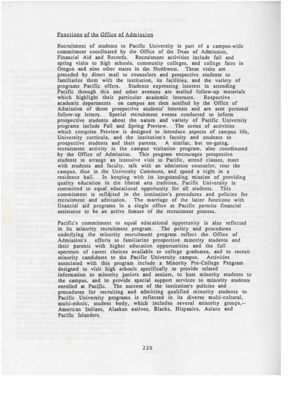 This selection shows a brief description of Pacific's minority recruitment program and its efforts to 'familiarize minority students and their parents with higher education opportunities' and which includes a Minority Pre-College Program that visited high schools to entice minority students.