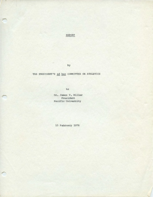 A report that was created by the President's Committee on Athletics on February 15, 1978 about Pacific University's athletic program. This report was sent to the Pacific University President, Dr. James V. Miller. The committee was composed of both faculty and students which included: Dr. Marshall Lee, Dr. Frank Buckiewicz, Dr. Miles Shishido, Dr. H. Joe Story, Kris Chatari, Cindy Dix, David Wolf, and Robert Slauson. The student members within the committee were involved in the athletic program at Pacific University and student life during 1977-1978 such as: Kris Chatari was a volleyball player, Cindy Dix was a soccer player, David Wolf was a part of the Game Sigma Frat, and Robert Slauson was a football player. Faculty member Dr. Frank Buckiewicz was also heavily involved in the athletic program as he was one of the football coaches for Pacific University. This diverse group of members allowed for different perspectives on the issues at hand within the athletic program. There were twenty sessions of these meetings from September to February. Students were able to provide insight on the athletic program because they were personally involved and participated. The faculty members provided their own opinions on how the athletic program was doing.