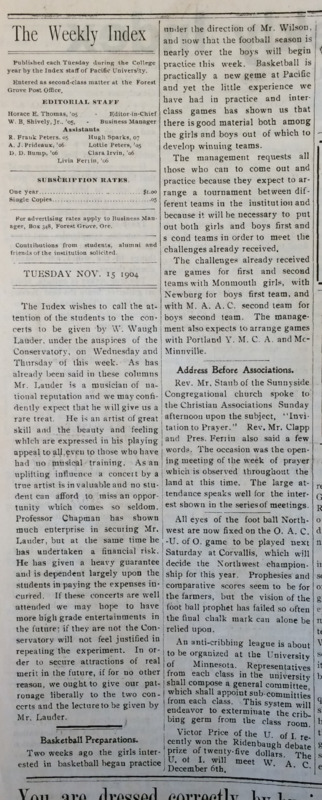 The Pacific University Index newspaper during 1904-1905 was compiled of 3 different articles involving women's basketball. The newspaper was mentioning how women's basketball was doing, the new rules that were applied, and about a game on how the women did. The article during November 15, 1904 discussed the preparation that women were doing such as basketball practices. It was an overview about women's basketball. The next article on January 24, 1905 was about a ruling at Pacific that was going to be applied in women's basketball. Men were excluded from attending the basketball games. There seemed to be an issue with women being proper while playing basketball publicly in front of men. Finally the last article on February 28, 1905 was about the first inter-class games between the girls. The details of the game was that the game was between the 4th year class versus the 3rd year class. The 3rd year team was compiled of: Ellen Brobst, Maverne Templeton, Jessie Hoge, Martha Holmes, and Everlyn Wing. The 4th year team included: Helen Chandler, Reba Hoffman, Laura Brock, Caroline Brown, and Mary Abenethy. The final score was 11-2 with the 4th year team winning the game. The only males that were allowed to go to the game were the male officials.