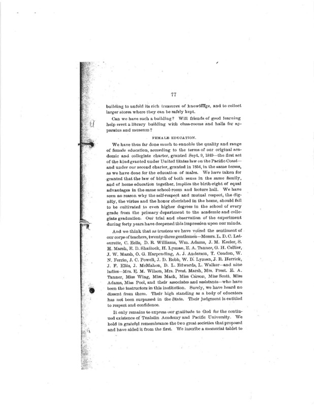 Atkinson sees female education at Pacific University as much needed. He desires to see the education of females and males happen in the same level, or the co-education of both groups as near equal to one another. It is not addressed to which extent that Dr. Atkinson desired the education of women, just that it was important to educate them, so that they could become more important to the society as a whole. This document is written for someone on the west coast, where females and males were more on equal grounds. Another document in this archive is written for the east coast of the United States, where Dr. Atkinson does not address the presence of women at the early Pacific University. That is not the case in this document.