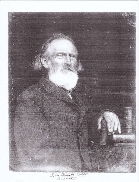 House is one story except for left end is two story with a gable front. The front porch starts at the right corner of the two story section and extends about half way across the front of the single story section. There is a white alternating picket fence with a gate between two large boxed fence posts. There are three people in the picture, a man, John F. Shorb, to the left of the front of the house, a woman, Addie Shorb, in the open doorway into the house and a man, John D. Shorb, with a beard sitting in a chair on the porch. All three are wearing hats and dressed in their finer clothing. There is a wood board sidewalk entering on the left side of the picture and extends across in front of the fence but terminates a short distance to the right if the gate.