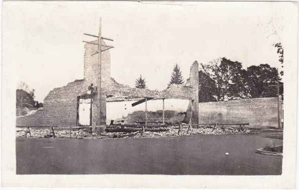 3 of 4 pictures taken the day after the July 20, 1919 fire in downtown Forest Grove. This picture was taken from the Northwest corner of Main Street and 21st Avenue looking toward the Southeast corner of Main Street and 21st Avenue. This picture shows the remaining brick walls of the Odd Fellows building and another brick wall on the right. The street looks to be paved with a curb. There is a metal protective strip on the corner curb for protection of the concrete from turning corners too close. Businesses destroyed by the fire are, Archibald Bryant’s Photo Gallery, Bryant’s Musical Instruments, Belle Darling’s Photo Gallery, O. M. Sanford’s second hand store and team of horses, Staehrl’s three story residence, Public Library, Washington Co. Poultry Association’s warehouse, A. B. Thomas three story residence, Palace Garage, C. H. Adams Millinery shop, Odd Fellows building, Allen & Co. Hardware in the Odd Fellows building, Leabo Livery Stable, vacant building of marble and granite works, unoccupied building and the Congregational Church. The Copeland & McCready Lumber Yards were on fire many times but saved and the Caples Building plate glass front was destroyed by the heat.