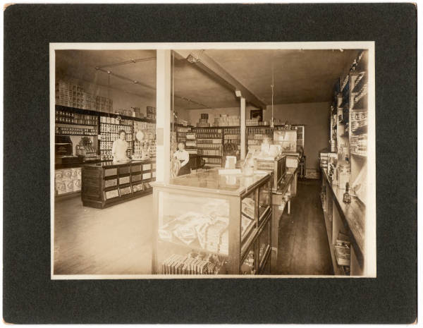 Picture taken inside a store from the front looking towards the back of the store. Two women are in the picture, one standing behind the left counter/showcase and the other sitting on the customer side of the same counter/showcase. This showcase contains bins of bulk consumables. There is an ornate cash register on the left wall along with shelves of canned goods. A scale is on the counter top next to the woman behind the counter and there is a dispenser for three sizes of paper for wrapping good is. A hand operated coffee grinder is next to the back wall. There is also a counter/showcase on the right side and the right wall is included in the picture. The close end of this showcase contains cigars. There is a Tip Top Bread cabinet at the fare end of the counter and shelves of canned goods on right side wall.