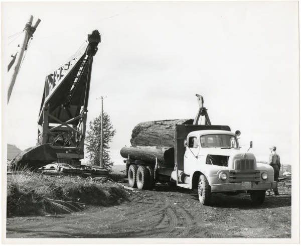 1 of 8 of a series of photographs showing a prototype boom unloading logs from a logging truck at Gales Peak Lumbermill. In this picture an International Harvester logging truck has arrived to have its logs unloaded. To the side of the truck is a machine equipped with the prototype boom, ready for the demonstration. This boom, produced by Wallace Dozers in Forest Grove, became the “Heel Boom” known throughout the Northwest for its advantages over older style booms in loading and unloading logging trucks.