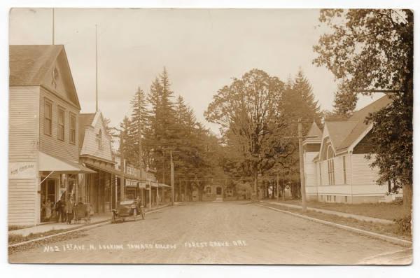 Picture taken from center of what was then called "North 1st Ave" (now renamed 21st Avenue), in Forest Grove, close to the intersection with Main Street, looking east towards Pacific University. On the left is a wood building with a sign on the side ICE CREAM In front of the store are two men and a boy. One man is leaning on a 4-wheeled cart on the sidewalk. There is a barber pole just behind these two men. Just a few feet down from these men is a right-hand steering open car with a man at the wheel. A building just beyond the car has a sign OREGON LAND COMPANY and next to it is THE BAZAAR then MILLINERY, BOOK STORE and CITY LIBRARY There is another man close to the Millinery sign. There is a two horse buggy parked at the end of the block by College Way. The street is packed dirt and the sidewalk and curb appear to be concrete. On the right is the wooden Congregational Church