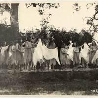 A photograph of a theatrical performance at Pacific University circa 1906-1908, possibly "The Bridge of the Gods: A Tale of Indian Oregon." This play, supposedly reenacting Native American myths, was based on a fictional story written by a white writer named Frederic Balch. It featured characters with names based on actual Native people, places and tribes such as "Multnomah," "Snoqualmie," and "Wallulah." Pacific University students dressed in redface to portray the characters. This photograph appears to show women students on an outdoor stage at Pacific University, dressed as Native girls. The play was very popular and was also performed in Portland, Seattle and other locations. It is also possible that this photograph shows another, unrelated performance; the staging matches that used during outdoor May Day performances around the same time.