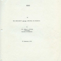 A report that was created by the President's Committee on Athletics on February 15, 1978 about Pacific University's athletic program. This report was sent to the Pacific University President, Dr. James V. Miller. The committee was composed of both faculty and students which included: Dr. Marshall Lee, Dr. Frank Buckiewicz, Dr. Miles Shishido, Dr. H. Joe Story, Kris Chatari, Cindy Dix, David Wolf, and Robert Slauson. The student members within the committee were involved in the athletic program at Pacific University and student life during 1977-1978 such as: Kris Chatari was a volleyball player, Cindy Dix was a soccer player, David Wolf was a part of the Game Sigma Frat, and Robert Slauson was a football player. Faculty member Dr. Frank Buckiewicz was also heavily involved in the athletic program as he was one of the football coaches for Pacific University. This diverse group of members allowed for different perspectives on the issues at hand within the athletic program. There were twenty sessions of these meetings from September to February. Students were able to provide insight on the athletic program because they were personally involved and participated. The faculty members provided their own opinions on how the athletic program was doing.