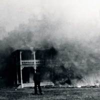 This is a photograph of the first Herrick Hall burning on Sunday, March 11, 1906. An unidentified man watches the building burn in the center of the photograph. Herrick Hall was the all-female residence hall on campus that all women were required to live in unless they had special accommodations to live in a house in the surrounding area in Forest Grove. The fire started at 11:oo am while everyone was attending church and was discovered by Professor F. T. Chapman. It was later discovered that sparks from the chimney fell on the roof and an east wind started the flames. Because the fire started at the top of the building, much of the contents of the building was able to be saved, though the building was not. It took three hours for the entire building to burn down. The fire could have easily spread to other buildings on and off-campus if it weren't for the efforts of the citizens, students, and fire department.