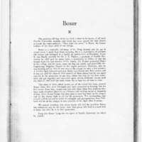 'Boxer' story on Boxer's history from the 1928-1929 Pacific University yearbook, also known as the 'Heart of Oak.' Some of the details about the Boxer statue's origins in China, such as the name of the city from which it came, are inaccurate. The text also includes details about a Boxer Toss that was planned for spring 1929.