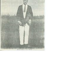 George Tucker, Pacific University Class of 1925, holding "Boxer," a bronze statue that was the symbol of Pacific University. A note on the back states that it was "taken near the bridge where Boxer was hidden by Lenore Conger, a Pacific freshman." Another version of this photograph (PUApic_010378) includes a note that it was taken in a field on the outskirts of Forest Grove, Oregon. Based on these notes, this photograph is dated to 1924-1925.