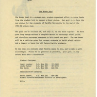 This letter to students, alumni and others who wish to have a new cast of Pacific University's mascot made are encouraged to donate to the Boxer fund. This fund is trying to raise money to have a new cast of the Boxer mascot created since the original has not been returned to Pacific after years of searching. The students wish to bring more school spirit to Pacific with this new cast. There is a brief history of how the Boxer became Pacific University's mascot following the letter encouraging donations.
