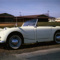 Richard Thompson was a Pacific University student who graduated in 1963. While he was enrolled, his fraternity Phi Beta Tau, won possession of the university's mascot, Boxer. In this photograph, taken around 1962, we see Richard Thompson's car, which was used as a getaway vehicle when transporting the Boxer mascot statue. The picture was probably taken near the old elementary school on the corner of SW Pacific Avenue and Highway 8 in Forest Grove. This photograph is from the collection of Richard Thompson, who retains the original print.
