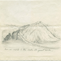 Drawing by Pherne Brown Pringle, the daughter of Tabitha Moffatt Brown, the 'Mother of Oregon.' This sketch features part of the scenery between the Continental Divide and American Falls, Idaho, during her family's journey on the Oregon Trail. Copies of later drawings were accompanied in an album by journal entries of Pherne's husband, Virgil K. Pringle.